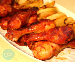 Możemy również zrobić kurczaka z ziemniakami. Wówczas na wyścieloną papierem do pieczenia blachę wyłożyć pałki kurczaka, tworząc na środku przestrzeń na ziemniaki.