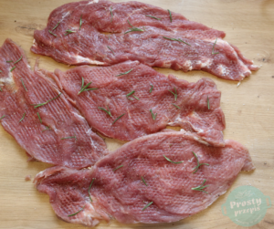 Posolić i popieprz każdą polędwiczkę, a potem rozłożyć gdzie nie gdzie rozmaryn.