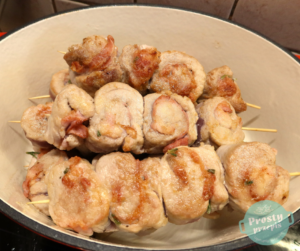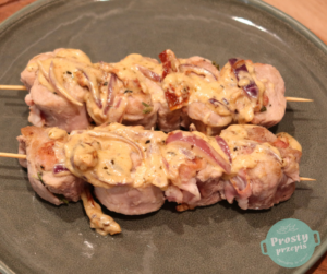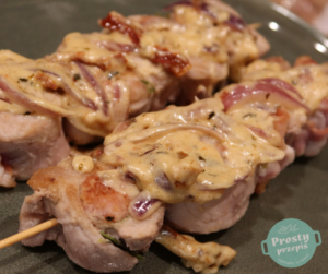 Rolowane szaszłyki z polędwiczek z boczkiem w środku w sosie z śmietanowym z suszonymi pomidorami