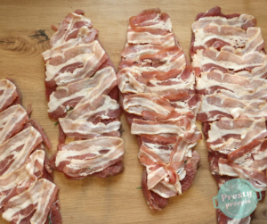 Na polędwiczkach rozłożyć plastry boczku i zwinąć każdą w ścisły rulon wzdłuż dłuższego boku.