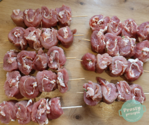 A następnie pokroić w plastry mniej więcej 1,5-2 centymetrowej grubości, nabić plastry na patyczki do szaszłyków, po trzy lub cztery na porcję.
