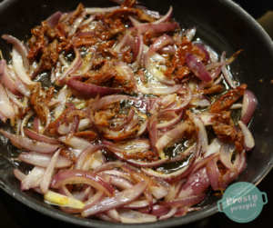 Cebulę pokroić w pióra i zeszklić na oliwie z pomidorów. Następnie dodać suszone pomidory pokrojone w paski. Wlać śmietankę i delikatnie oprószyć mąką, aby sos nieco zgęstniał.