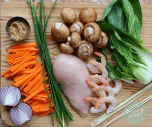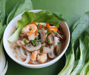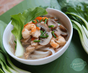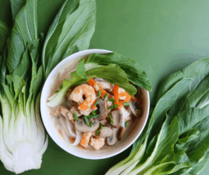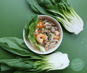 Rozgrzewająca zupa z grillowanym kurczakiem i krewetkami, pak choi, brązowymi pieczarkami i trawą cytrynową