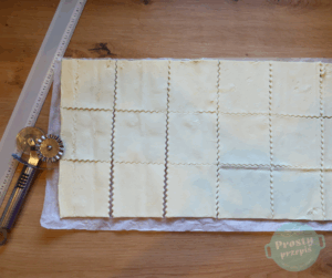 Rulon ciasta francuskiego rozłożyć i pociąć na równe kwadraty. Ilość sakiewek zależy od wielkości wyciętych kwadratów, u mnie wymiary około 8 x 8 cm.