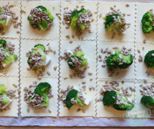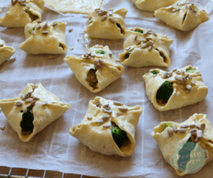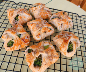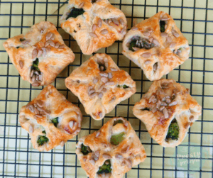 Sakiewki ciasta francuskiego z serkiem topionym, brokułem i pestkami