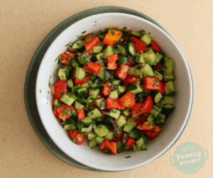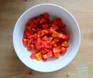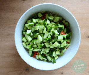 Z pomidorów wydrążyć zdrewniały środek. Pokroić w mniejszą kostkę, wrzucić do salaterki.