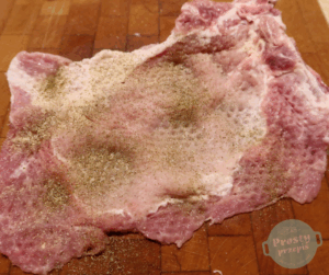 Potłuczony kawałek mięsa posypać solą i pieprzem oraz czosnkiem granulowanym (można też świeżym przeciśniętym przez praskę), a następnie naciąć co centymetr przy samej kości, by mięso przy niej równomiernie się usmażyło.