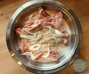 Cebulę pokroić w piórka, rozłożyć kilka kawałków na każdy plaster schabu i każdy polać delikatnie mlekiem. Układać jeden na drugi. Wstawić do lodówki najlepiej na całą noc.