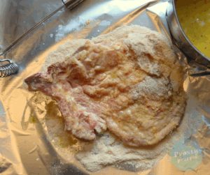 Przyprawiony już kotlet panierować klasycznie – w mące, jajku i bułce tartej.