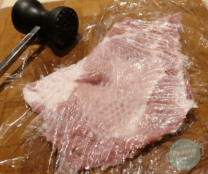 Każdy kawałek mięsa delikatnie i z umiarem potłuc z każdej strony (ja tłukę przez folię spożywczą, aby mięso nie chlapało na boki).