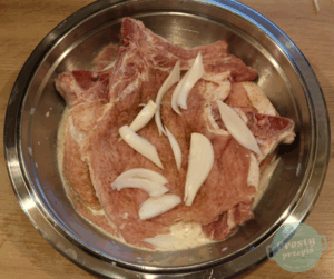 Cebulę pokroić w piórka, rozłożyć kilka kawałków na każdy plaster schabu i każdy polać delikatnie mlekiem. Układać jeden na drugi. Wstawić do lodówki najlepiej na całą noc.