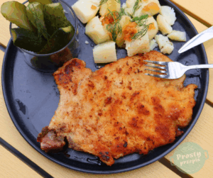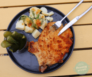Podawać z ziemniakami, ryżem, frytkami… U mnie dzisiaj z ziemniakami z wody polane chrupiącymi skwarkami plus ogórki małosolne.