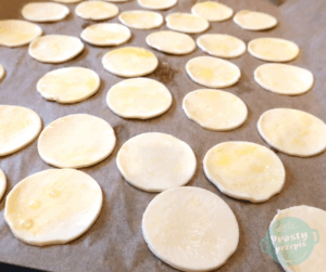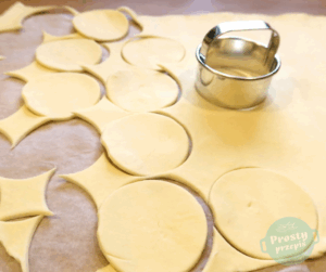 Rulon ciasta rozłożyć i wyciąć na nim kółka o średnicy około 5-6 cm, można użyć specjalnego wykrawacza albo kieliszka lub małej szklanki. Każde kółko posmarować roztrzepanym jajkiem. Piec w piekarniku rozgrzanym