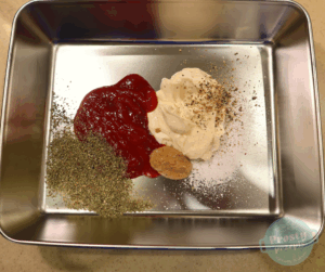 W naczyniu, w którym będziemy panierować skrzydełka, wymieszać wszystkie składniki marynaty: majonez, keczup, musztardę oraz wszystkie przyprawy. Sól i pieprz do smaku, majeranku wsypać porządną łyżkę.