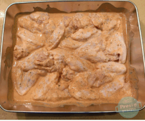 W marynacie zamarynować skrzydełka, dokładnie wymieszać, aby wszystkie się nią pokryły. Zostawić na minimum godzinę w temperaturze pokojowej, a najlepiej na całą noc w lodówce.