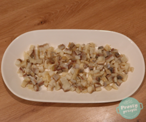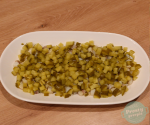Najpierw ułożyć śledzia pokrojonego w mniejszą krostę (można też śledzia pokroić w dzwonki), a na niego ogórka kiszonego, którego również pokroić w kostkę wielkości śledzia.