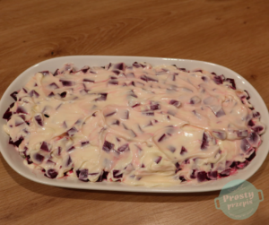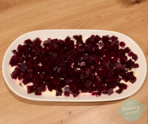 Buraki pokroić podobnie w kostkę i wyłożyć na warstwę majonezu.