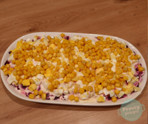 Kolejną warstwą będzie jajko pokrojone również w kostkę oraz kukurydza odsączona z zalewy.