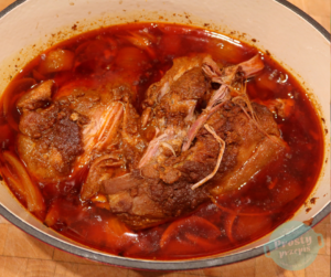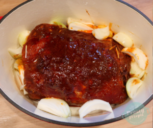 Piec pod przykryciem w 110 stopniach przez 6-7 godzin. Mięso jest gotowe, kiedy rozpada się pod widelcem, więc należy co jakiś czas sprawdzić jak się miewa.