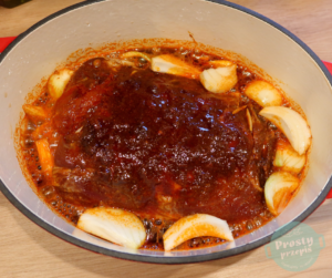 Piec pod przykryciem w 110 stopniach przez 6-7 godzin. Mięso jest gotowe, kiedy rozpada się pod widelcem, więc należy co jakiś czas sprawdzić jak się miewa.