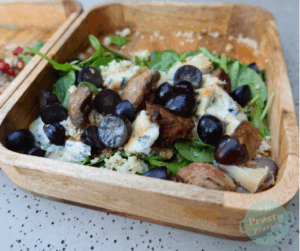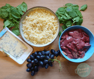 Szpinak z wątróbką, serem pleśniowym i winogronem