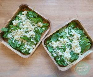 Kaszę kus-kus przyrządzić według instrukcji na opakowaniu. Po ostudzeniu rozsypać na szpinaku.