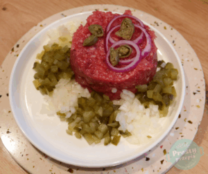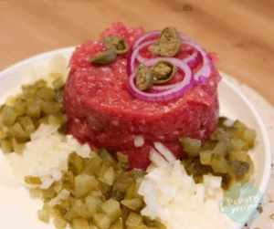 Samo mięso na tatar wołowy nie ma jednak intensywnego smaku, pomagamy mu więc dodatkami: cebulką, kiszonymi lub konserwowymi ogórkami, kaparami, marynowanymi grzybkami (np. pieczarkami lub kurkami), musztardą francuską