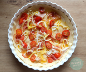 Na tortillę wyłożyć ser, plastry ulubionej szynki, pomidorki pokrojone w plasterki, cebulę pokrojoną w cienkie półtalarki oraz niedbale rozłożć porwane kawałki boczku.