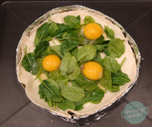 Na tortillę wyłożyć świeży szpinak i rozbić trzy jajka, które posolić i zmielić na nie świeży pieprz.