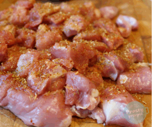 Udziec z indyka oczyścić i pokroić w mniejszą kostkę. Posypać przyprawą do kurczaka i pougniatać mięso ręką.