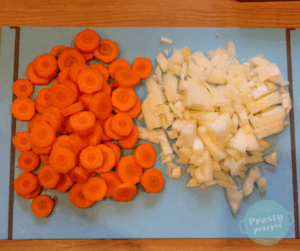 Cebulę pokroić w kostkę, przesmażyć na oleju, następnie dodać marchewkę i pieczarki pokrojone w cienkie plasterki.