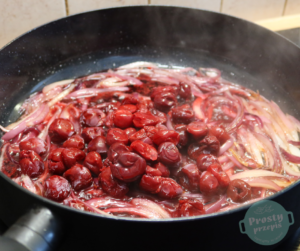 Gdy sos wiśniowy będzie gotowy, połowę wrzucić do blendera i zmiksować na gładką masę, drugą połowę pozostawić w całości.