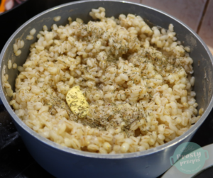 Kaszę pęczak ugotować według przepisu na opakowaniu, pod koniec gotowania dodać pełną łyżkę masła i suszony tymianek. Gdy się ugotuje do miękkości, pozostawić pod przykryciem około 15 minut.