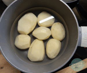 Ziemniaki obrać, ugotować w osolonej wodzie, pilnować, aby się nie rozgotowały, muszą być nawet trochę twarde. Następnie odcedzić i chwilę zostawić garnek na palniku bez pokrywki, aby odparowała woda.