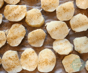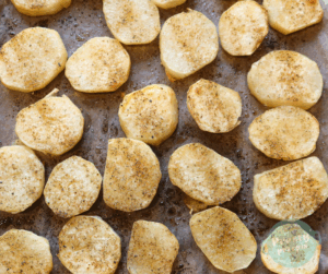 Plastry rozłożyć na blaszce do pieczenia wyścielonej papierem. Polać oliwą z oliwek i posypać przyprawą do ziemniaków. Zarumienić w piekarniku nagrzanym do 200ºC (piec około 30 minut).