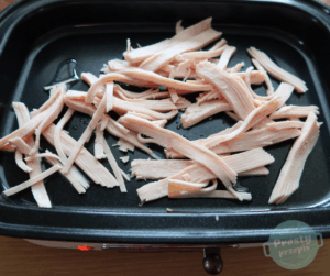 Wędlinę pokroić w cienkie paski. Przesmażyć i lekko zarumienić.