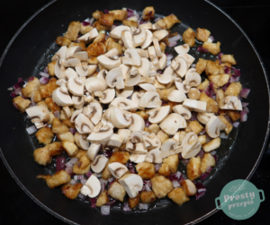 Dorzucić pieczarki pokrojone w grubsze plastry.