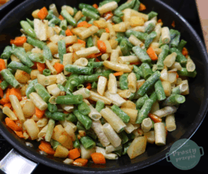 Dorzucić fasolkę szparagową. Chwilę wszystko przesmażyć, następnie dodać do bulionu i zagotować.