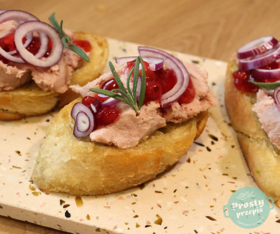 Kremowy pasztet połączony z żurawiną na chrupiących grzankach. Całość podkreślona krążkami czerwonej cebuli i konfiturą z żurawiny. U mnie grzanka przesmażona na maśle z datkiem oliwy z oliwek i obowiązkowo z czosnkiem. Idealna przekąska na imprezę lub kolację.