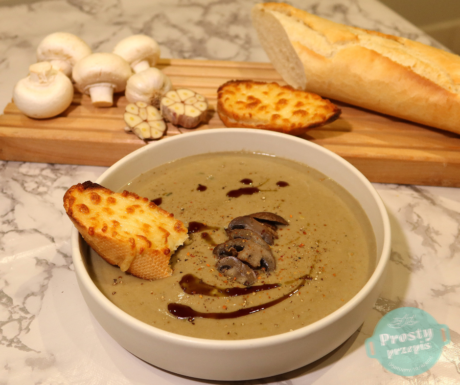 Krem pieczarkowy to zupa, którą robi się dość szybko. Ma gęstą i aksamitną konsystencję, a pod wpływem pieczenia pieczarki i czosnek wydobywają głębie swoich aromatów. Serowe grzanki dopełniają całość.